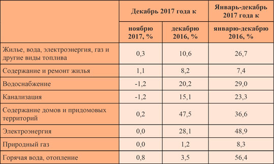 Согласно опубликованным цифрам, повышение стоимости жилищно-коммунальных услуг в декабре 2017 года, по отношению к декабрю 2016 года составило, в среднем, 10,6%. В период с января по декабрь 2017 года, по сравнению с аналогичным периодом 2016 года, ЖКУ подорожали на 26,7%.