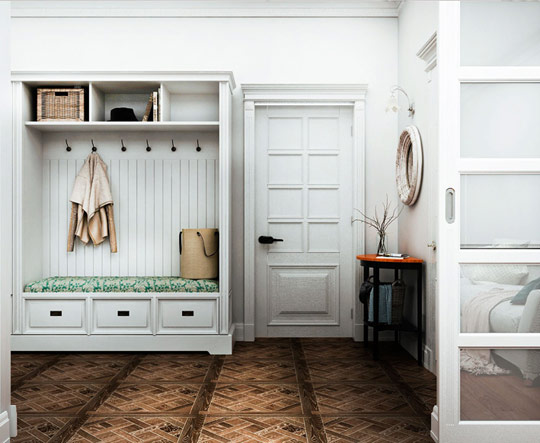Дизайн квартиры выполнен в стиле современной классики. Так как чистый белый цвет очень утомляет глаз, в квартире использован жемчужный цвет самого светлого оттенка. Светлые стены в интерьере подчеркивают чистоту стиля. В ней нет чрезмерности.