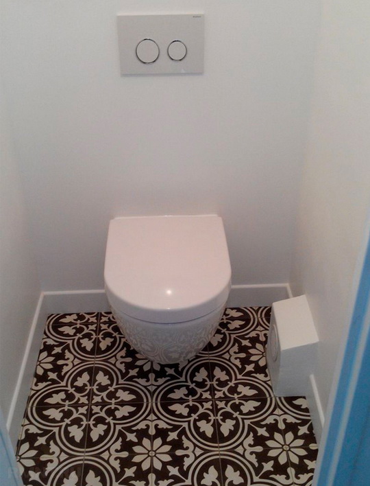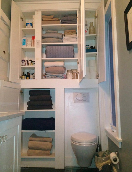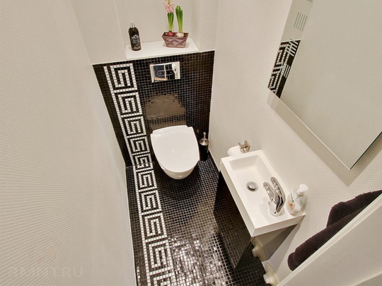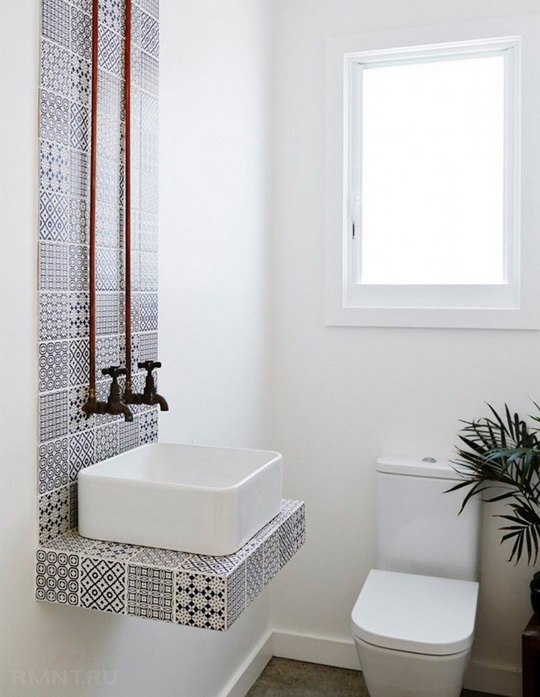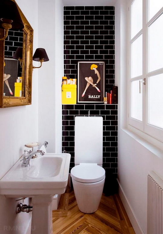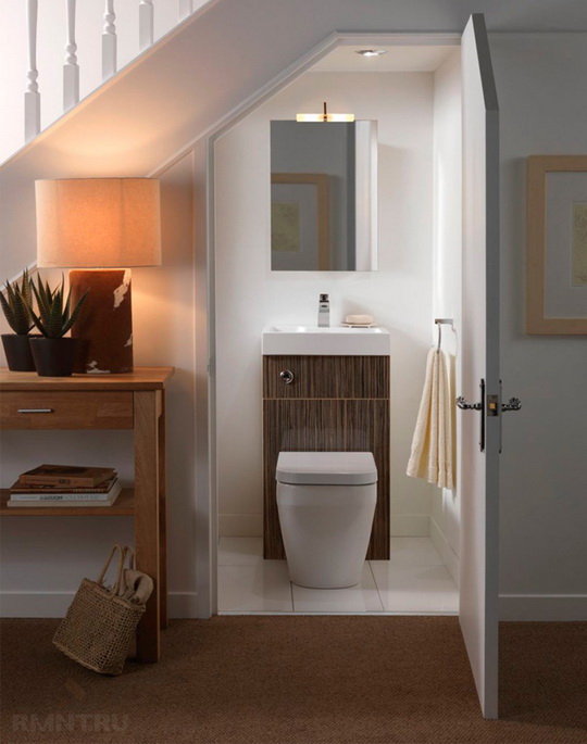 Вы увидите н одной из этих фотографий необычное расположение раковины на тумбе — за унитазом. Не уверены, что пользоваться ей будет очень удобно, но лучше так, чем вовсе без раковины, в которой можно вымыть руки после посещения туалета. Кстати, сам санузел расположился под лестницей — хорошая идея для владельцев частных домов.