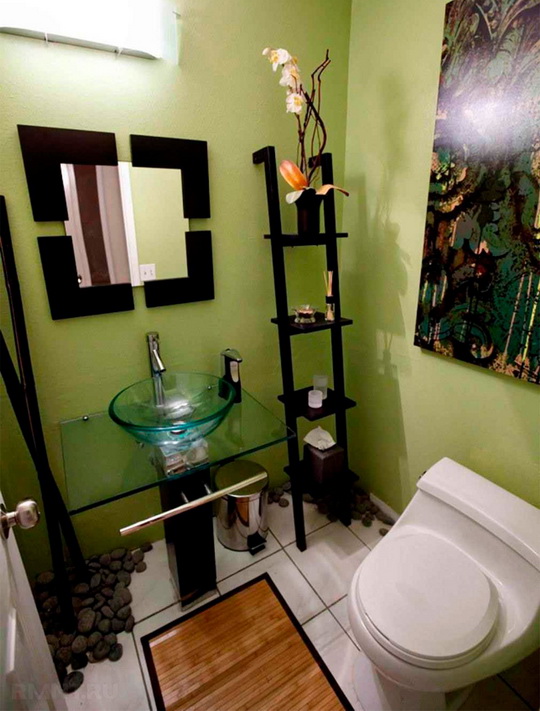 Можно создать очень яркий санузел в тропическом стиле. Коврик-циновка, орхидея, картина с зеленью, деревянные подставки и даже галька, просто рассыпанная по углам — все детали отлично сложились в общую привлекательную картину оригинального интерьера.