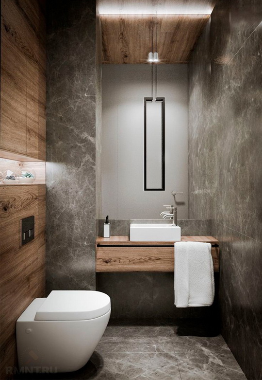 Использование двух видов отделочных материалов является очень выигрышным ходом, особенно в тесных помещениях. Сама по себе, ультрасовременная сантехника тоже может стать деталью декора за счёт оригинального внешнего вида.