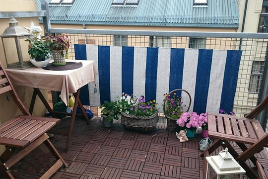 Укрыть нижнюю часть балкончика от посторонних глаз можно просто тканью, желательно крепкой, не выгорающей на солнце. Можно, использовать, например, баннерную ткань, которая обычно используется для создания наружной рекламы.