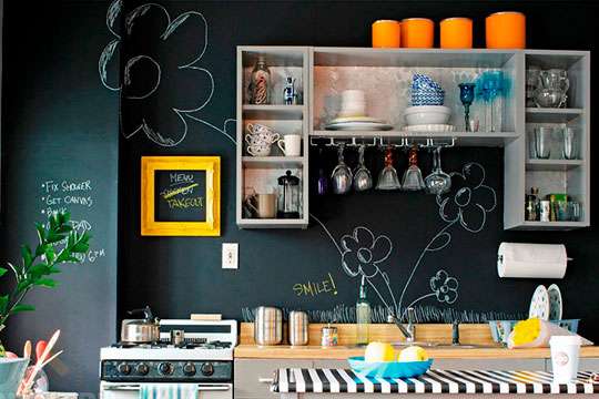Покрывать грифельной краской все стены комнаты, конечно, не принято. Это оригинальный декоративный приём, который может стать заметной деталью оформления, например, зоны для завтраков на кухне.