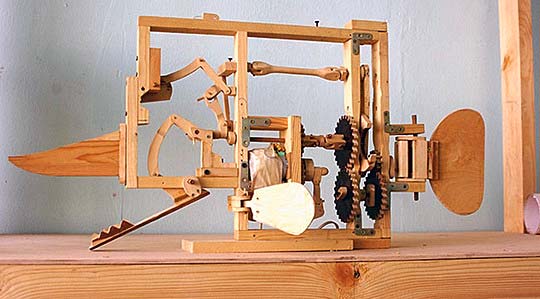 Была сделана из простых материалов: мебельных уголков, палочек для суши, проволочек от сломанного трансформатора. Рычаги вырезали из липы при помощи ножа, оси — из шпажек для шашлычка и зубочисток, а шестерни выпилили ручным лобзиком.