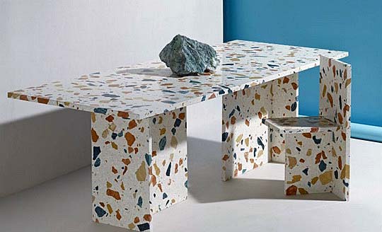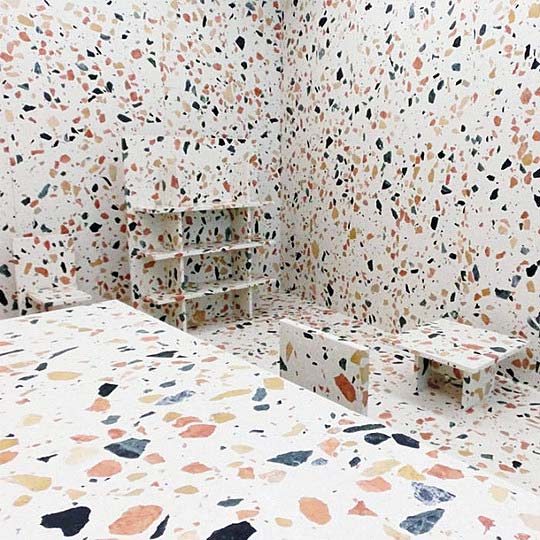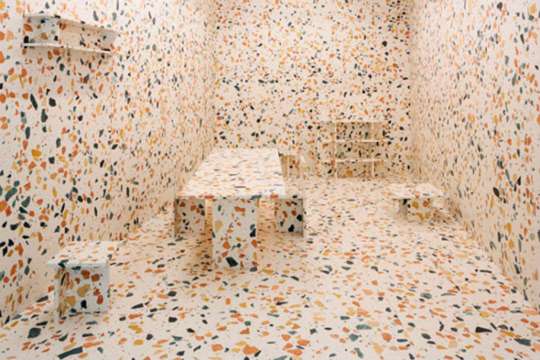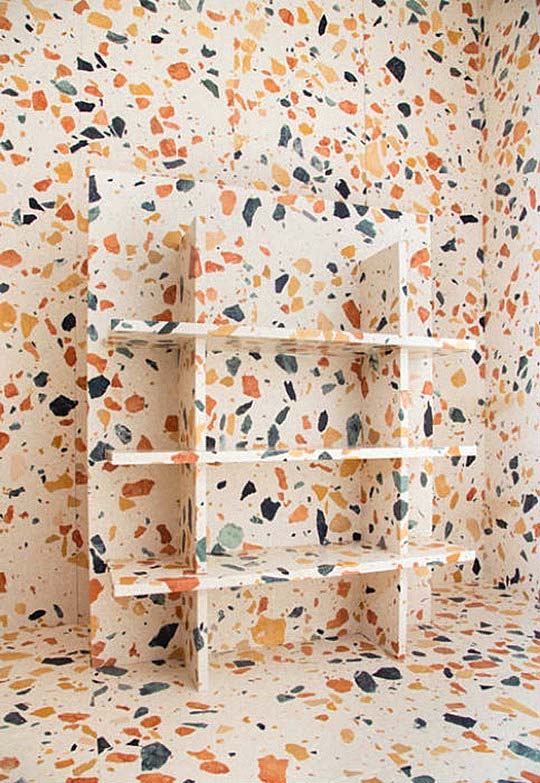 Зеленый Verde Alpi, охристо-желтый Giallo Mori, красноватый Rosso Verona, а также белый Bianco Verona, были выбраны мастером для создания Marmoreal. Сочетание этих камней с добавлением небольшого количества полиэфирных смол, порождает особый многоцветной материал, который оказывается прочнее натурального камня. Marmoreal может использоваться для производства плитки или комплектующих для мебели. Яркий тому пример – мебель в павильоне Макса Лэмба. Всё, начиная от стеллажа и заканчивая книжной полкой, было сделано из простых геометрических блоков этого удивительного материала.