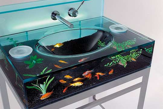 Раковина-аквариум на верхней фотографии, наверняка, поразит гостей. И умываться, любуясь юркими рыбками, будет наверняка веселее. Но ухаживать за таким аквариумом будет сложнее, чем за обычным.