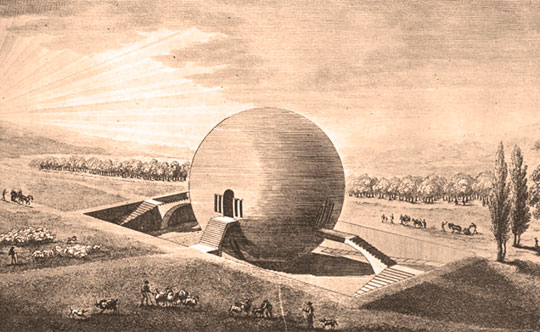 … Однако, такие полеты архитектурной мысли существовали и раньше… К наиболее известным примерам такой «бумажной архитектуры» прошлого можно отнести серию графических работ итальянского архитектора XVIII века Д.-Б. Пиранези из цикла «Архитектурные фантазии», а также, работы французских архитекторов эпохи барокко и классицизма Клода Леду, Жан Жака Леке, Этьена Булле…