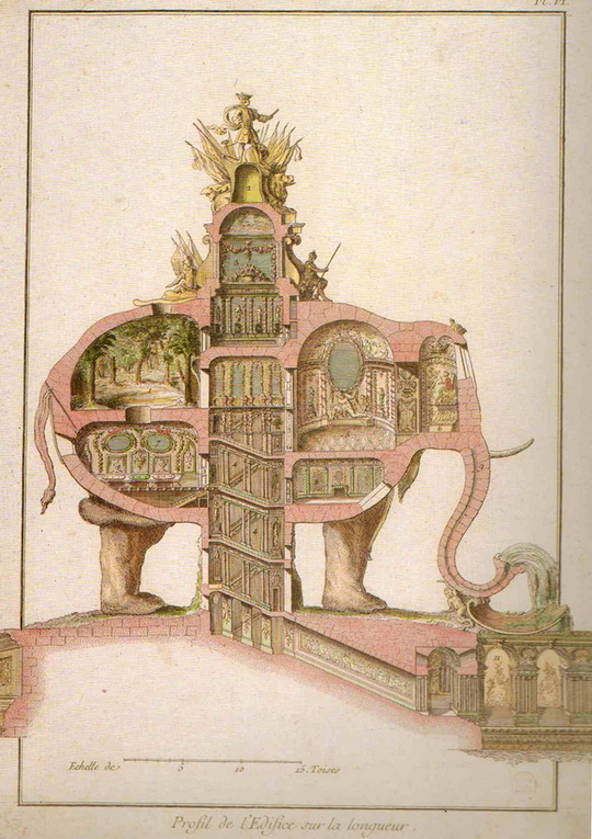 Ще більш незвичайна робота, це будівля виконане в формі слона. «Барочний слон» (хто б міг подумати, що подібне може бути написане не в фантастичному творі) з гвинтовими сходами в трубі, яка прорізає його живіт, з пишним внутрішнім оздобленням кімнат, фонтаном, пливучого з хобота і вежі, дзвоном розташованого на спині слона.