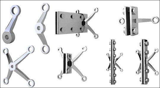 Для фиксации панелей применяются различные крепежные элементы — рутели, коннекторы и спайдеры, остекление без которых выполнить невозможно. Назначение этих изделий определяется маркой стали. Крепления из нержавеющей стали 304-го сплава применяются для внутреннего остекления, а 316-го — для наружного, поскольку обладают повышенными антикоррозийными свойствами. Вид поверхности спайдера зависит от обработки и может быть сатинированной, зеркальной и крашеной краской PVF.