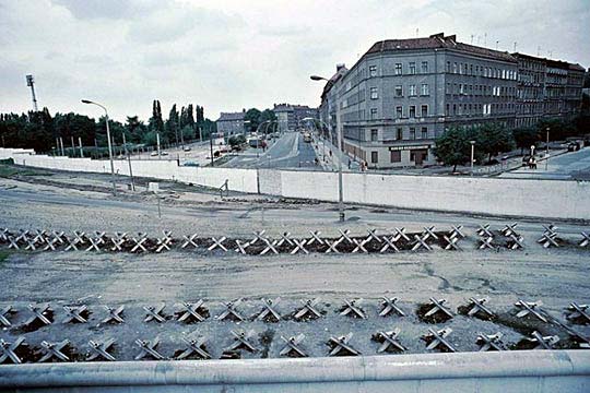 … Строительство и переоборудование стены продолжалось с 1962 по 1975 год. Первоначально, она представляла собой бетонные плиты или кирпичную кладку с установленными кронштейнами с колючей проволокой, в первые дни на отдельных участках это и вовсе были спирали Бруно, лежавшие на мостовой, которые можно было легко преодолеть ловким прыжком, чем смогли воспользоваться некоторые перебежчики.