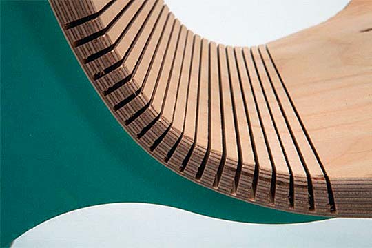 Облегчить размягчение толстой фанеры также можно перфорацией заготовки. Отверстия диаметром в 2–3 значения толщины фанеры выполняют корончатой фрезой или сверлом Форстнера в шахматном порядке с шагом около 80–100 мм между ними. Степень перфорации может быть и больше, это определяется как податливостью фанеры к сгибанию, так и требуемой итоговой прочностью детали. Естественно, такой метод изгиба подходит только для скрытых технологических элементов, не образующих финишной плоскости. При желании, согнутую деталь можно обшить с одной или обеих сторон шпоном или тонкой фанерой, предварительно размягчив их.