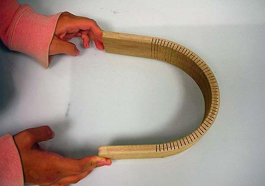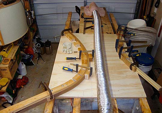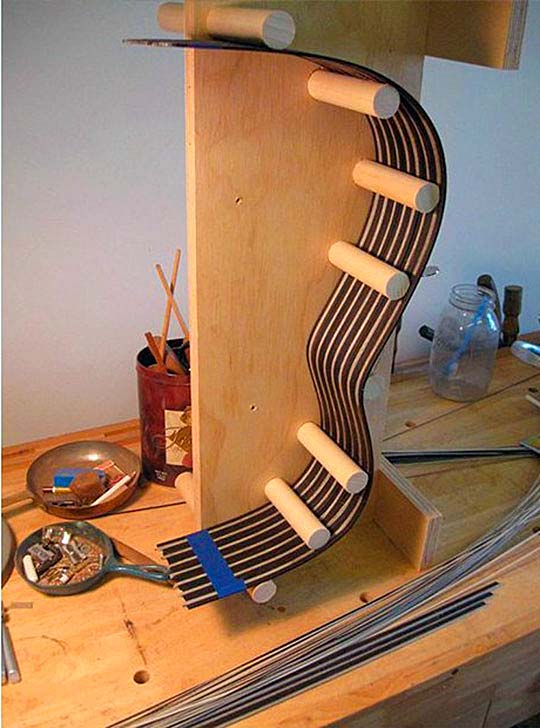 Другая разновидность шаблона — каркас из брусьев, не образующий точного контура изгиба. В этом случае, поперечные брусья располагают в точках прижима, то есть, на самых выступающих и вогнутых частях профиля детали. Для крепления в промежуточных точках, можно добавить в каркас произвольное количество перемычек.