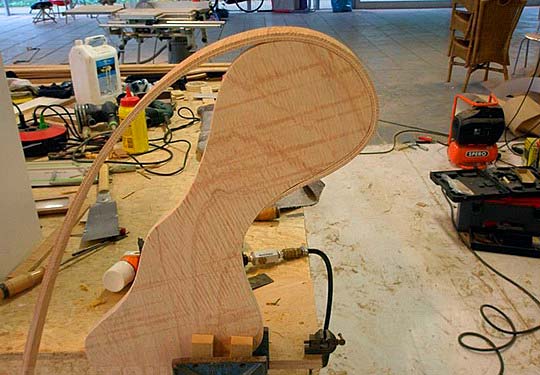 Согнуть детали сложной формы можно, путём поочередного наклеивания слоёв распаренного шпона на заготовку требуемой формы. На практике, это метод избежать возни с толстыми деталями, ибо, на крутых изгибах гораздо проще иметь дело с тонкими листами из-за малых значений допустимого радиуса.