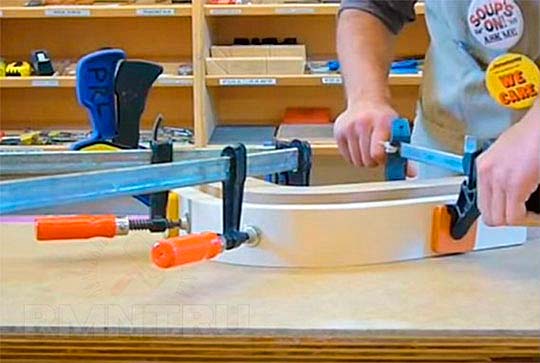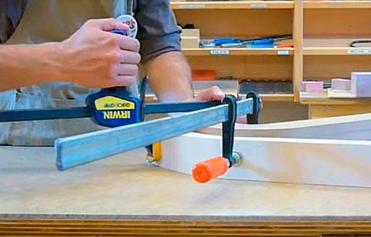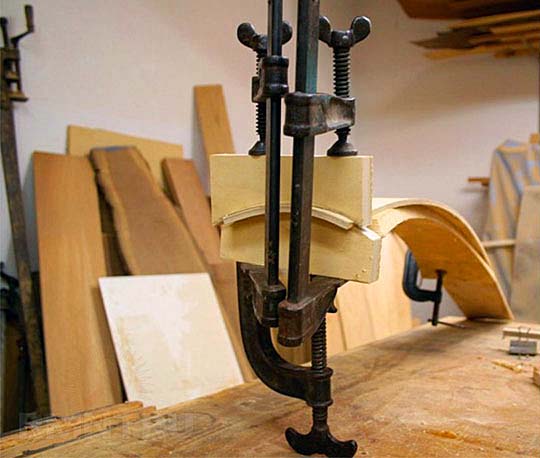 При изготовлении каркаса нужно учитывать тип используемых прижимных устройств. Так, на вкладышах из фанеры могут быть предусмотрены отверстия для губок струбцин, а сам каркас может комплектоваться дополнительными рёбрами жёсткости в направлении действия прижимных и растягивающих нагрузок. Если деталь имеет равномерный изгиб по всей длине, её можно зафиксировать и без каркаса, например, стянуть верёвкой, тросом, цепью с винтовым фаркопом или при помощи строповочных ремней.