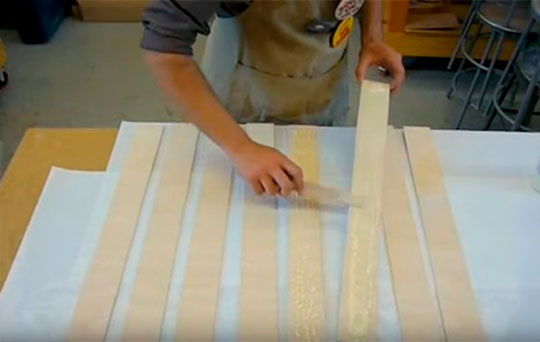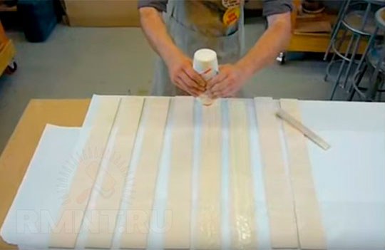 Перед фиксацией на шаблоне, образованные на фанере надрезы заполняют качественным клеем для древесины, например Titebond 2. Выступающий клей можно сразу снять шпателем или отшлифовать после высыхания. На время застывания клея, фанера жёстко фиксируется на шаблоне.