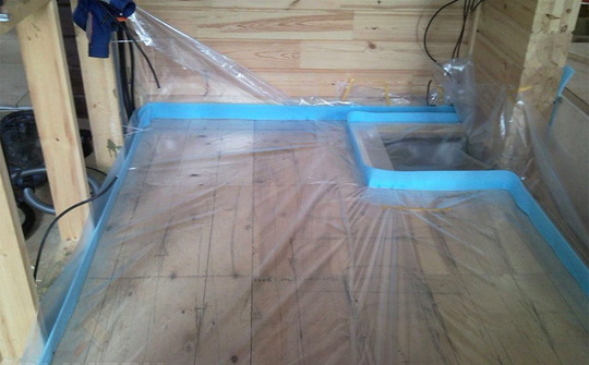 При устройстве стяжки по деревянному полу первый шаг — надёжная гидроизоляция. Сначала, по периметру помещения к стенам пристреливается компенсационная лента из вспененного полиэтилена толщиной 5–6 мм. Если планируется включать в стяжку нагревательные элементы, к доскам приклеивают плиты пенополистирола.