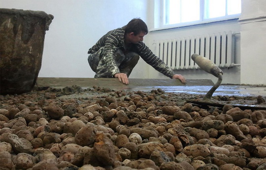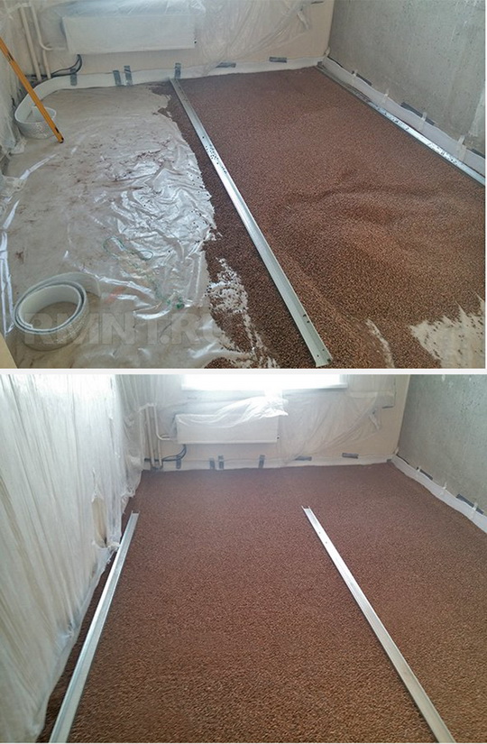 Насыпка ведётся одним слоем, который выравнивается по переставным маякам и хорошо уплотняется. Сверху выровненную насыпь нужно укрыть полиэтиленовой плёнкой и после завершения выравнивания передвигаться только по трапам из жёсткого листового материала.
