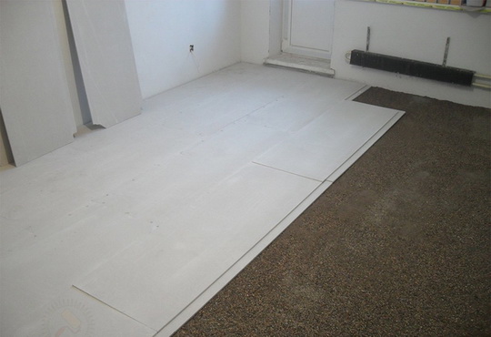 Последний, третий вариант подразумевает наличие между деревянным полом и листовой обшивкой слоя сыпучего материала произвольной толщины. Это требуется в тех случаях, когда подвижность чернового настила выражена крайне сильно и нет иных способов её компенсировать. Недостаток последних двух способов — практическая невозможность устроить подогрев пола и большая материалоёмкость.
