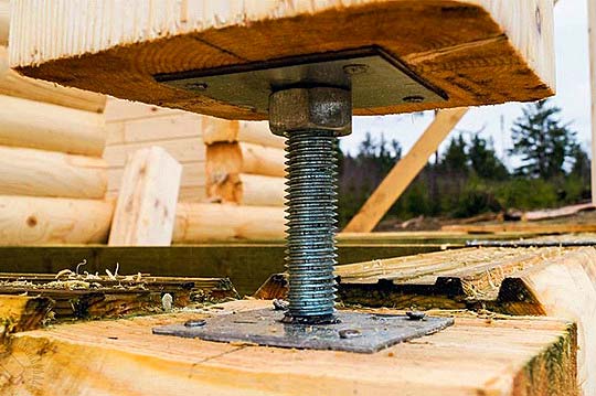 Процесс использования винтового компенсатора так же прост, как его конструкция: по мере усадки деревянного дома регулировочную гайку подкручивают, ответная пластина постепенно опускается. Собственно, гайка исполняет роль стопора. Бревно вертикальной опоры специально делается немного ниже изначально, образовашийся зазор и перекрывается компенсатором. Постепенно зазор просто сходит на нет, а сам винтовой домкрат полностью скрывается между фундаментом и опорным бревном или брусом.