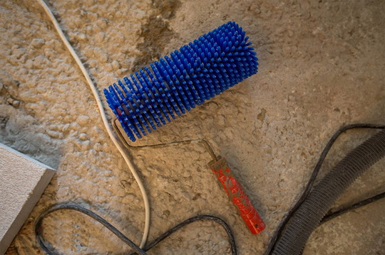 Иногда, для избавления от пузырьков из смеси для наливного пола, применяются жёсткие щётки на длинной рукоятке, однако игольчатый валик намного удобнее и легче в работе.
