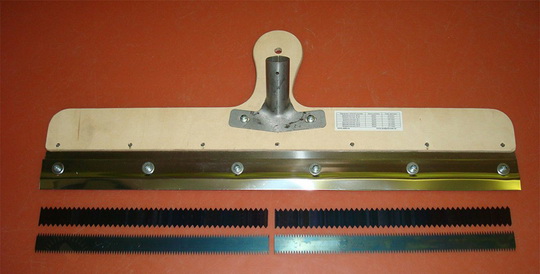 - Ракля (ракель). По сути, это тот же малярный шпатель, просто с длинной ручкой и зубчатыми насадками, которые можно менять в зависимости от толщины слоя наливного пола. Раклей удобно работать на больших поверхностях, а вот по углам лучше использовать обычный зубчатый шпатель. Важно помнить, что есть ракли для цементных и гипсовых смесей, а есть — для полимерных. Ручка ракли должна быть достаточно прочной, ведь на неё приходится серьёзная нагрузка. Это, обычно, самый дорогой инструмент для монтажа наливного пола из всего комплекта;