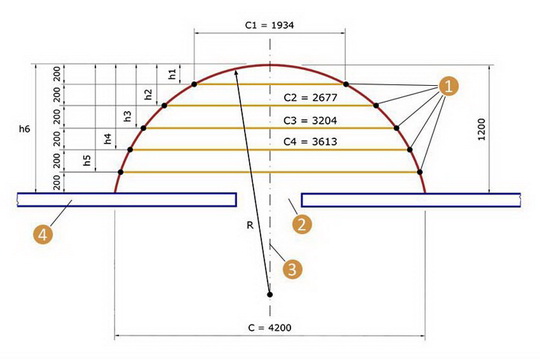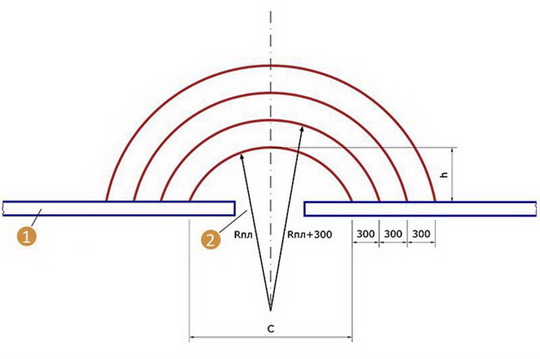 - С1 = √ (R – h1 / 2) х 8h1, где h1 — высота 1-го сегмента (200 мм).