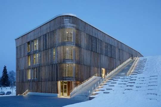 Наконец, авторы сыграли на эстетической составляющей: они «обернули» гараж в фасад из деревянных реек. Интерьеры подсвечены теплыми лампами, а линии склона — точечными светильниками. Гараж воспринимается как огромный фонарь в темном жилом районе. Он заставляет обратить на себя внимание и становится новым акцентом для заплутавших туристов, лыжников и романтиков.